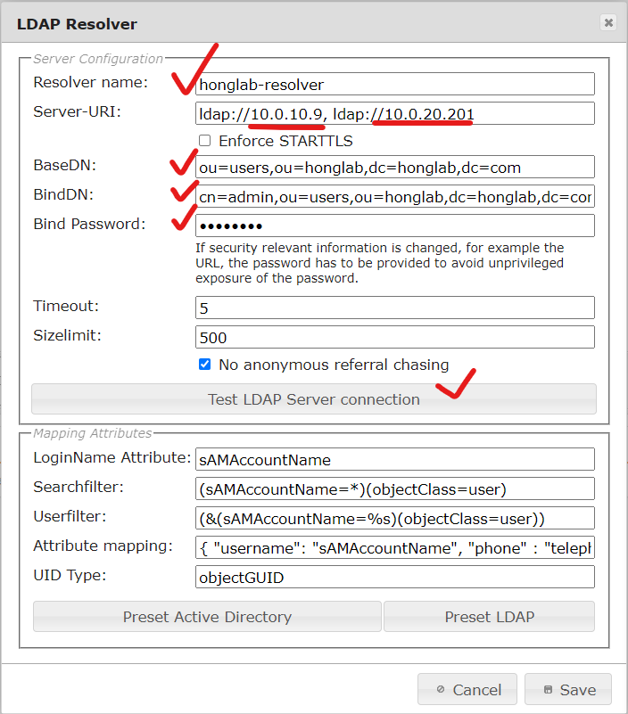 이름은 맘대로 정하고, Server-URI의 ldap:// 뒤에는 내 Directory의 DNS 주소 2개를 각각 적어준다