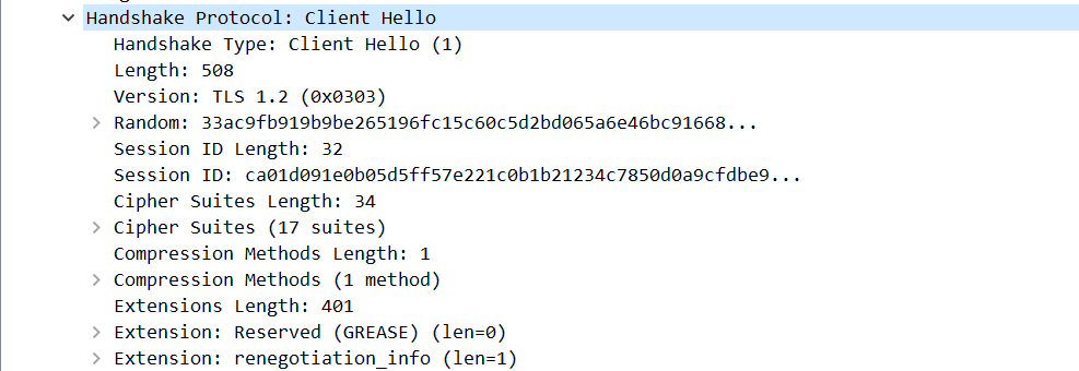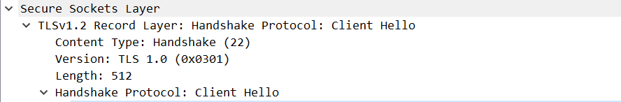 Handshake Type 필드의 값 (1)을 통해 해당 패킷이 Client Hello에 관련된 패킷이라는 것을 알 수 있다. 또한, client가 지원할 수 있는 Version 중 가장 높은 것이 TLS 1.2 라는 것을 확인할 수 있다. {0x0300 : SSL 3.0, 0x0301 : SSL/TLS 1.0, 0x0302 : SSL/TLS 1.1, 0x0303 : SSL/TLS 1.2}