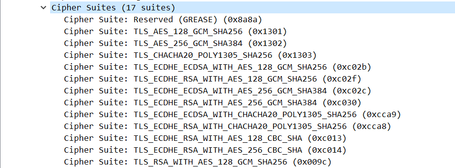 Client Hello의 Cipher Suites에서는 해당 Client의 브라우저에서 지원할 수 있는 암호화 방식의 목록을 보여준다. 위의 그림에서는 17개의 암호화 방식을 지원함을 나타내고 있다.