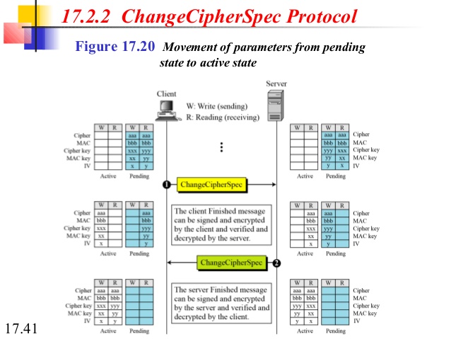 ChangeCipherSpec 메시지를 교환하기 전에는 대기 열만 값들을 가지게 되고, client가 ChangeCipherSpec 메시지를 보낸 뒤에, client는 대기에서 활성으로 write 매개변수가 변한다. client는 이제 outbound 메시지를 서명 또는 암호화하는데 해당 매개변수들을 사용할 수 있다. server는 client가 보낸 이 ChangeCipherSpec 메시지를 수신한 뒤에, 대기 상태에서 활성 상태로 read 매개변수가 변한다. 이제 server는 메시지를 복호화하거나 검증할 수 있다.