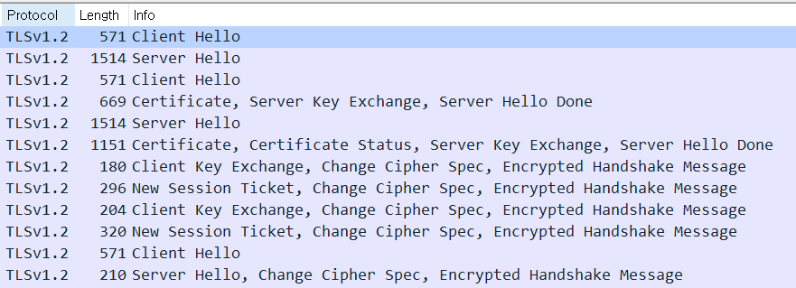 Display filter에서 ssl.handshake 혹은 ssl.record.content_type == 22를 사용하여 TLS Handshake 관련 세션을 확인할 수 있다.