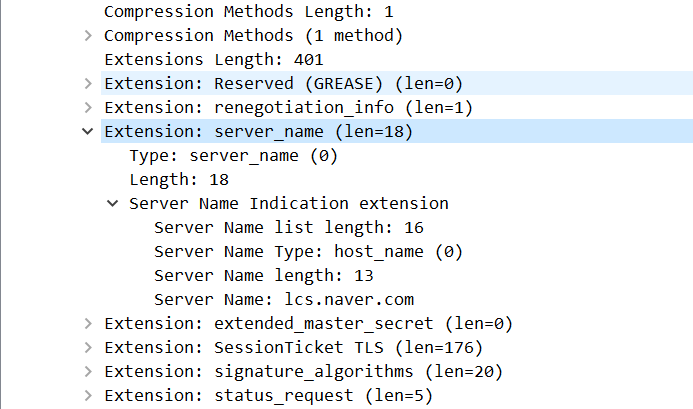 위의 그림에서는 TLS Extension 필드들을 확인할 수 있다. Extension 필드는 선택적으로 사용된다. Extension 필드는 매우 다양한 정보들을 가질 수 있는데 필드 중 server_name 필드는 Server의 이름을 포함하고 있다.