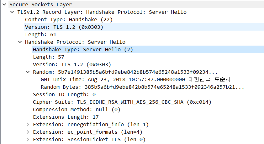 server hello의 경우에도 Content Type은 Handshake를 갖는다. 다만, Handshake Type 값을 2로 Server Hello의 값을 갖는다. server hello에서 역시 client hello와 마찬가지로 Version과 Random 값을 확인할 수 있다. Session ID 값이 0일 경우, 새 세션임을 나타낸다. 0이 아니라면 재시작된 세션이다. Cipher Suite는 이전 client가 지원하는 암호화 방식 중 하나를 선택하여 선택된 방식을 client에게 보낸다. 또한, 선택적으로 Extension 필드가 사용될 수 있다.