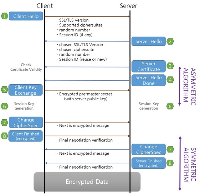 이후, client와 server는 SSL의 버전, 키 교환, 메시지 인증과 암호화를 위한 알고리즘, 압축 방법, 키 생성을 위한 2개의 난수를 알게 된다.