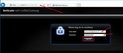 Start a browser on your desktop, and navigate to the hostname where the virtual server is listening. In my case that is https://vpn.vikash.nl. This translates to the IP address of the virtual server on my NetScaler.