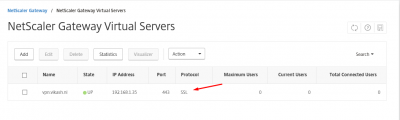 In the overview of the NetScaler Gateway Virtual Servers we can see the virtual server being available with status UP.