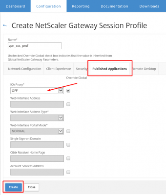 Click on the Published Application tab and make sure that ICA Proxy is set to OFF. Then click on Create.