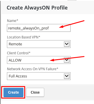 Give the AlwaysON profile a name and set Client Control to ALLOW. Click then on Create.
