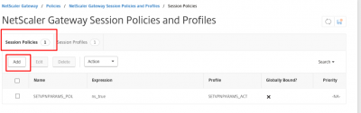 After creating the session profile, it is time to create the Session Policy for the session profile we just created. Navigate to NetScaler Gateway -> Policies -> NetScaler Gateway Policies and Profiles -> Session Policies. Click on Session Policies and then click on Add to create a new policy.