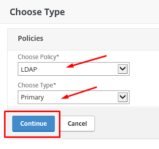 Select LDAP for Active Directory authentication. Choose Primary as Type. Click on Continue.