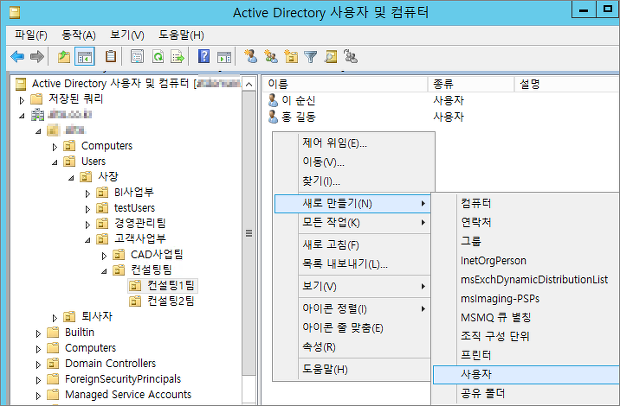 Active Directory 사용자 및 컴퓨터 관리 콘솔에서는 사용자 계정을 생성한다거나, 패스워드를 리셋한다거나, 컴퓨터를 사용 안 함 상태로 만들어 로그온을 차단한다거나 등과 같은 사용자와 컴퓨터에 대한 작업을 할 수 있습니다.