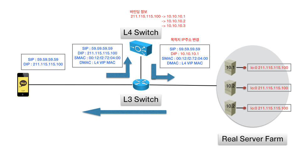 위 그림을 보면 클라이언트는 Destination IP가 211.115.115.100 인 서버로 Request를 보낸것이므로 동일한 IP로부터 Response를 받아야 합니다. LB장비에서는 211.115.115.100 에 바인딩된 Real Server호스트들의 IP정보를 갖고 있고 IP헤더의 Destination IP를 변조 후 실제 서버로 전달합니다. L2DSR의 경우는 L2 Layer의 Destination MAC 주소를 변조 후 서버로 전달하는데 이 부분이 L2DSR과 L3DSR의 차이점입니다. 이때 서버에서는 Destination IP가 211.115.115.100 으로 들어온 패킷을 자신의 IP가 아니라고 판단하고 버리게 되므로 서버의 lo:0 인터페이스에 VIP를 설정하여 사용합니다.