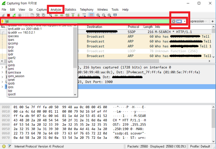 이 곳에다가 원하는 필터링 식을 적용하거나 상단 메뉴에 Analyze > Display Filters... 에 들어가서 적용할 수 있다.
