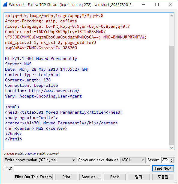 - 세션별로 조립한 것을 Stream이라고 하는데 밑에 예제에서는 TCP로 통신되고 있는 패킷들을 조립해서 내용을 확인해본 것이다.