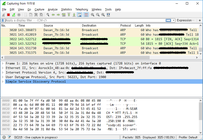 (물론 따로 설명하진 않았지만 프로그램 중간에 패킷에 대한 자세한 정보를 볼 수도 있고 프로그램 하단에 패킷을 HEX (16진수 바이트)로 볼 수도 있다.)