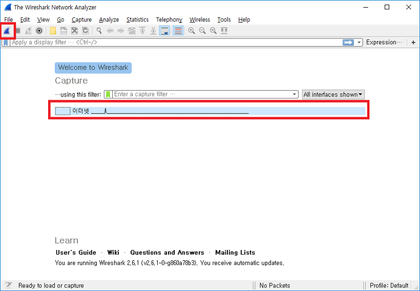 가운데 빨간색 박스를 보면 자동으로 와이어샤크가 이더넷 인터페이스를 찾아놨다.