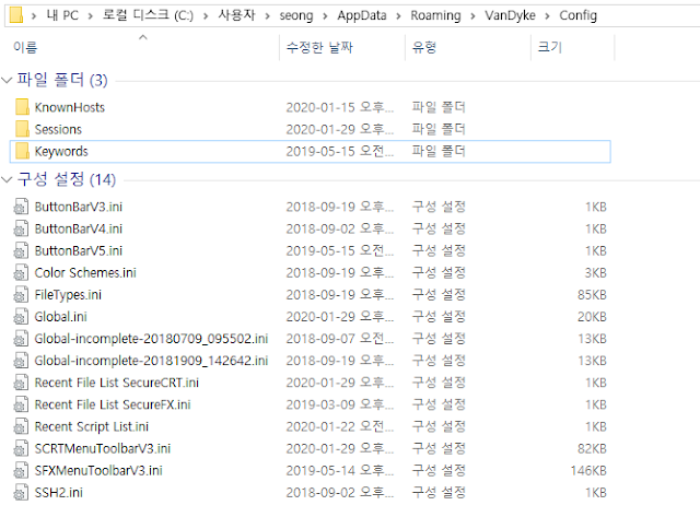 C:\Users\[유저계정]\AppData\Roaming\VanDyke\Config\Sessions 로 이동