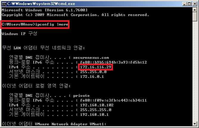보통 VMware 등을 설치하게 되면 가상 네트워크 어뎁터가 여러개 잡혀있습니다. 그래서 바로 ipconfig 만 치면 화면이 밑으로 많이 내려가게 되는데, 파이프 (Shift + \) + more 명령어를 입력하여 상위 목록을 확인하면서 천천히 내려주시면 됩니다.